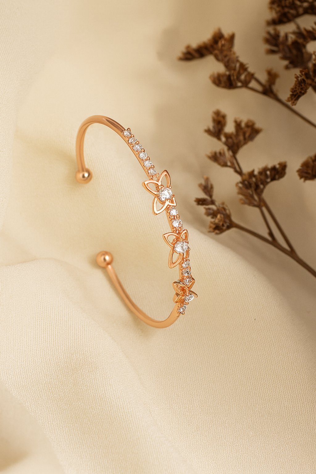 Jewello presents a fashionable rose gold-plated cuff bracelet, beautifully embellished with shimmering white stone studs. Designed as an elegant kada bracelet for women and girls, it blends charm with sophistication. Perfect for festive occasions, parties, or everyday wear, this exquisite accessory adds sparkle, elegance, and timeless beauty to every look.