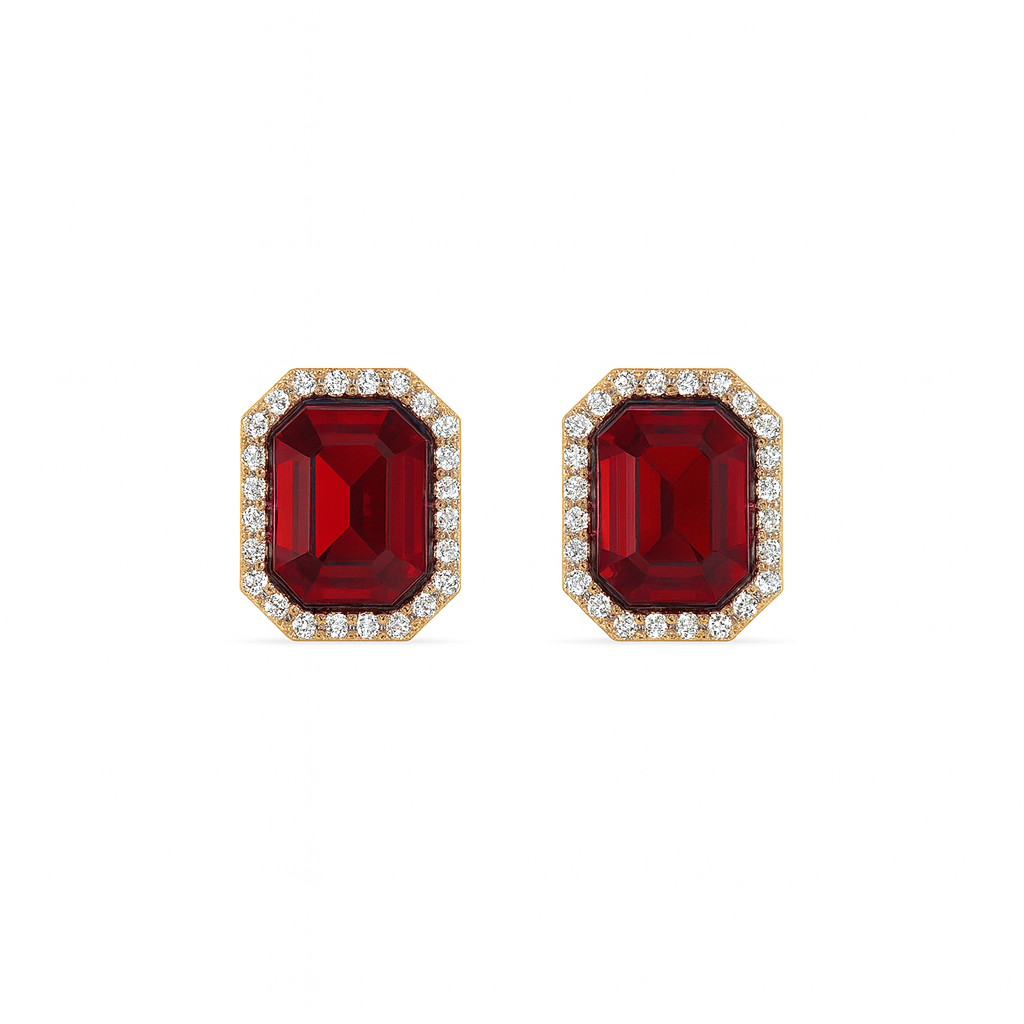 Jewello's delicate gold-plated red colour cubic zirconia stud chain pendant, earring and finger ring set for women and girls.
